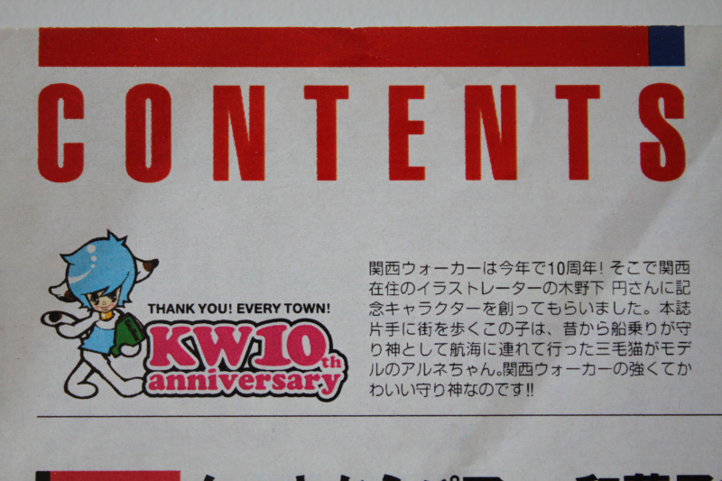 雑誌関西ウォーカーの10周年記念キャラクターをデザインをさせて頂きました。三毛猫のアルネくんです。雄の三毛猫は貴重な為、 船に乗せるとその船は沈まないと言われている事から、20周年30周年と無事に続きますようにとの思いを込めたキャラクターです。