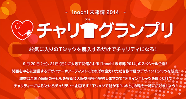 イベントinochi未来博2014で販売されるチャリティTシャツのデザインをしました。収益の一部が全国心臓病の子どもを守る会大阪支部等へ寄付されます。